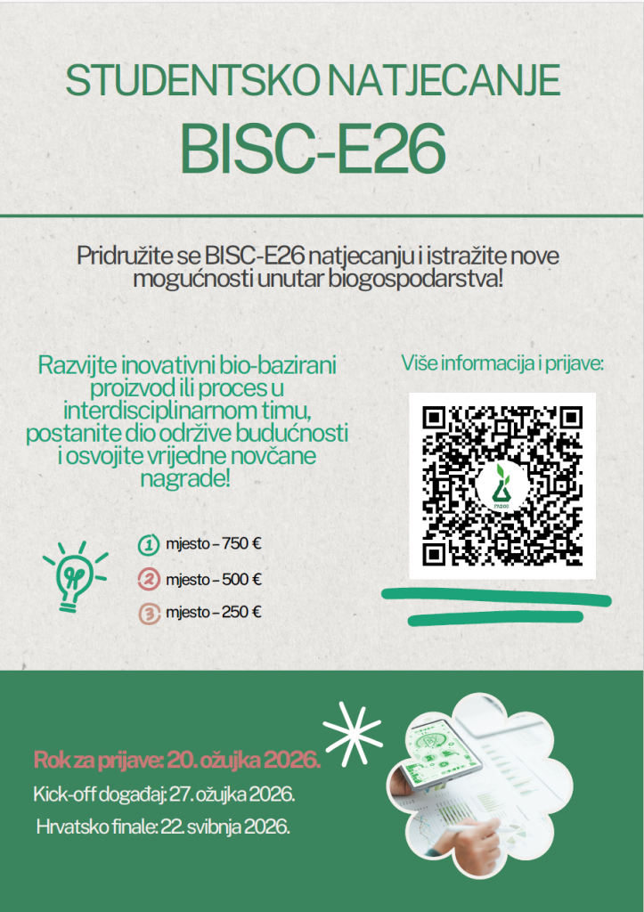 Fakultet agrobiotehničkih znanosti Osijek, u suradnji s Bio-based Industries Consortiumom (BIC) i Association of European Life Science Universities (ICA), s ponosom četvrtu godinu zaredom organizira Bio-based Innovation Student Challenge 2026 (BISC-E26) europsko studentsko natjecanje usmjereno na inovacije u području bio-bazirane industrije i održive bioekonomije.