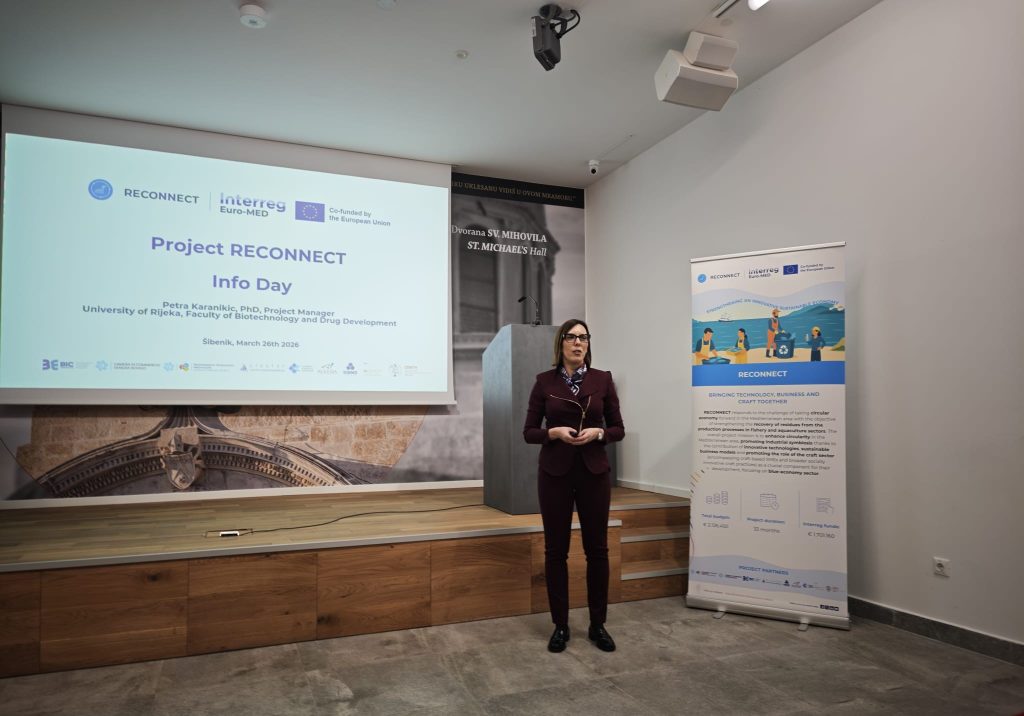 U četvrtak, 26. ožujka 2026. godine, u Šibeniku je uspješno održan RECONNECT Info Day u organizaciji Sveučilišta u Rijeci – Fakulteta biotehnologije i razvoja lijekova (UNIRI FABRI). Događaj se održao u Interpretacijskom centru katedrale sv. Jakova „Civitas sacra“, u Galbianijevoj palači, te je okupio dionike iz sektora akvakulture i ribarstva, predstavnike institucija, poduzetnike i zainteresiranu javnost.