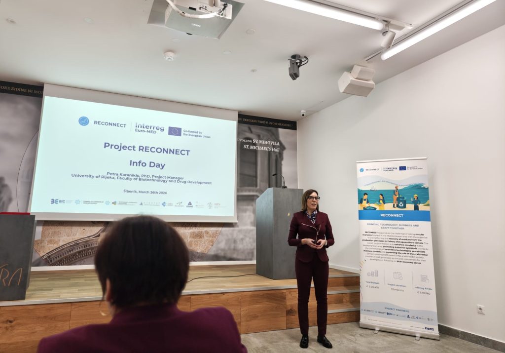 U četvrtak, 26. ožujka 2026. godine, u Šibeniku je uspješno održan RECONNECT Info Day u organizaciji Sveučilišta u Rijeci – Fakulteta biotehnologije i razvoja lijekova (UNIRI FABRI). Događaj se održao u Interpretacijskom centru katedrale sv. Jakova „Civitas sacra“, u Galbianijevoj palači, te je okupio dionike iz sektora akvakulture i ribarstva, predstavnike institucija, poduzetnike i zainteresiranu javnost.